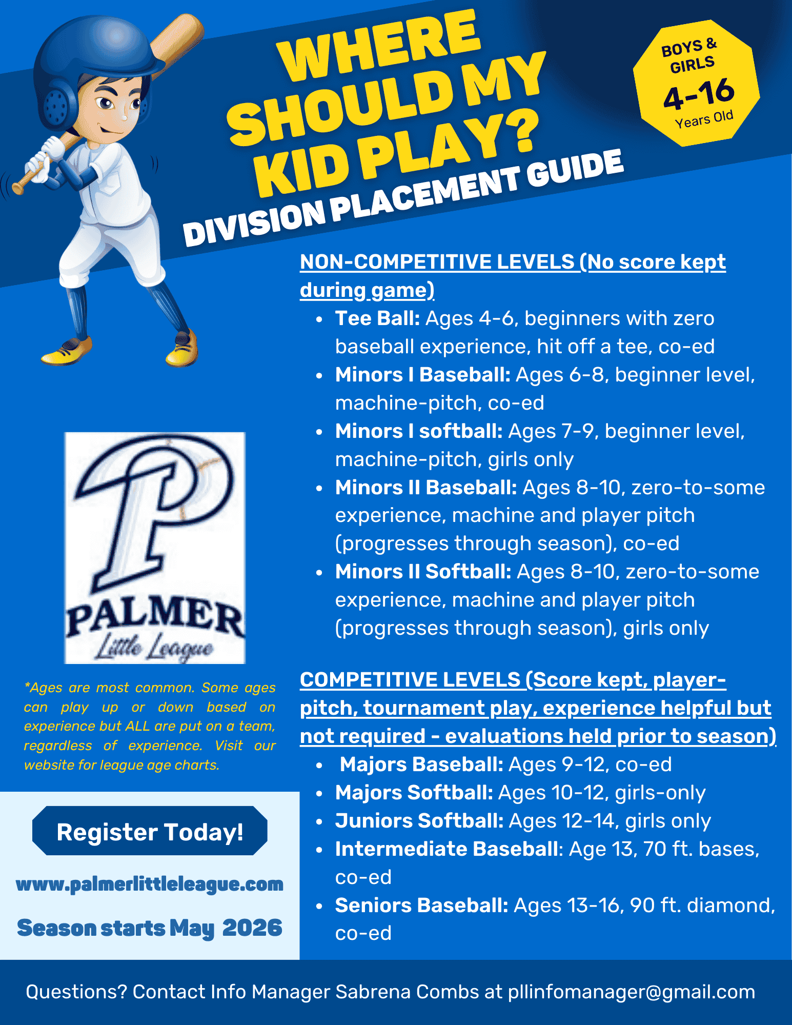 Evaluations for Majors and Seniors Baseball and Majors and Juniors Softball are set for April 18, 2026. Registration closes for these divisions on April 15, 2026.